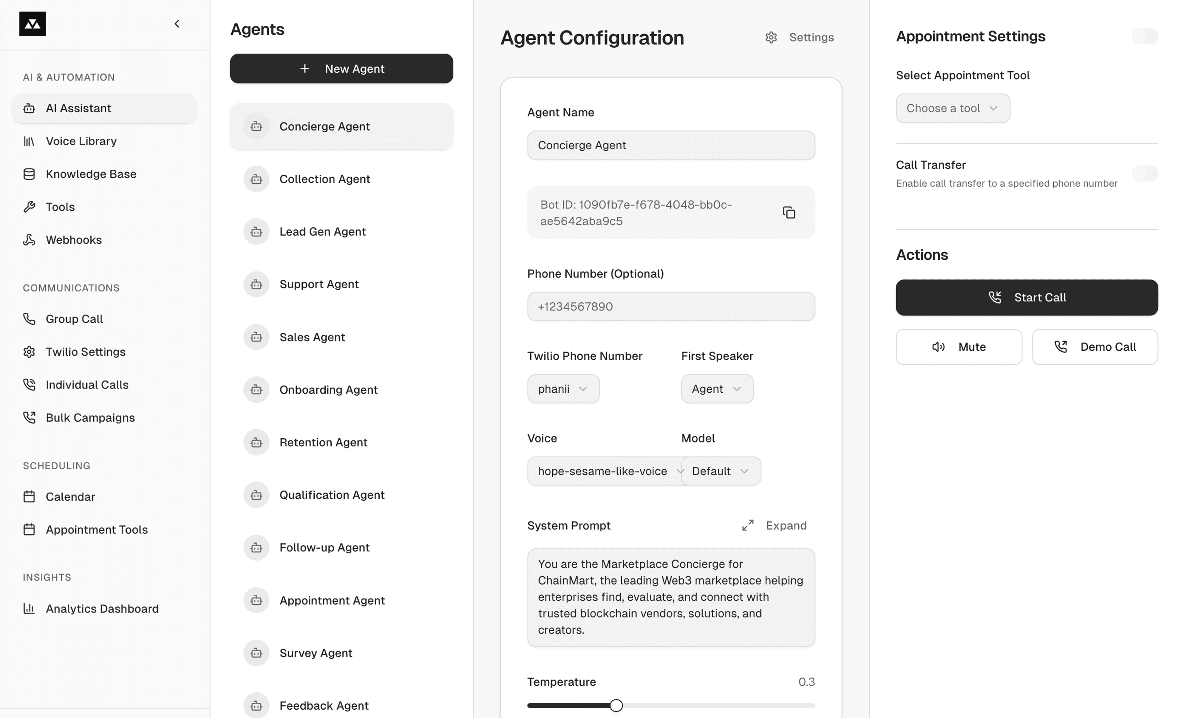 Launch your AI callers across phone, chat, or SMS with one click—no complex setup required.