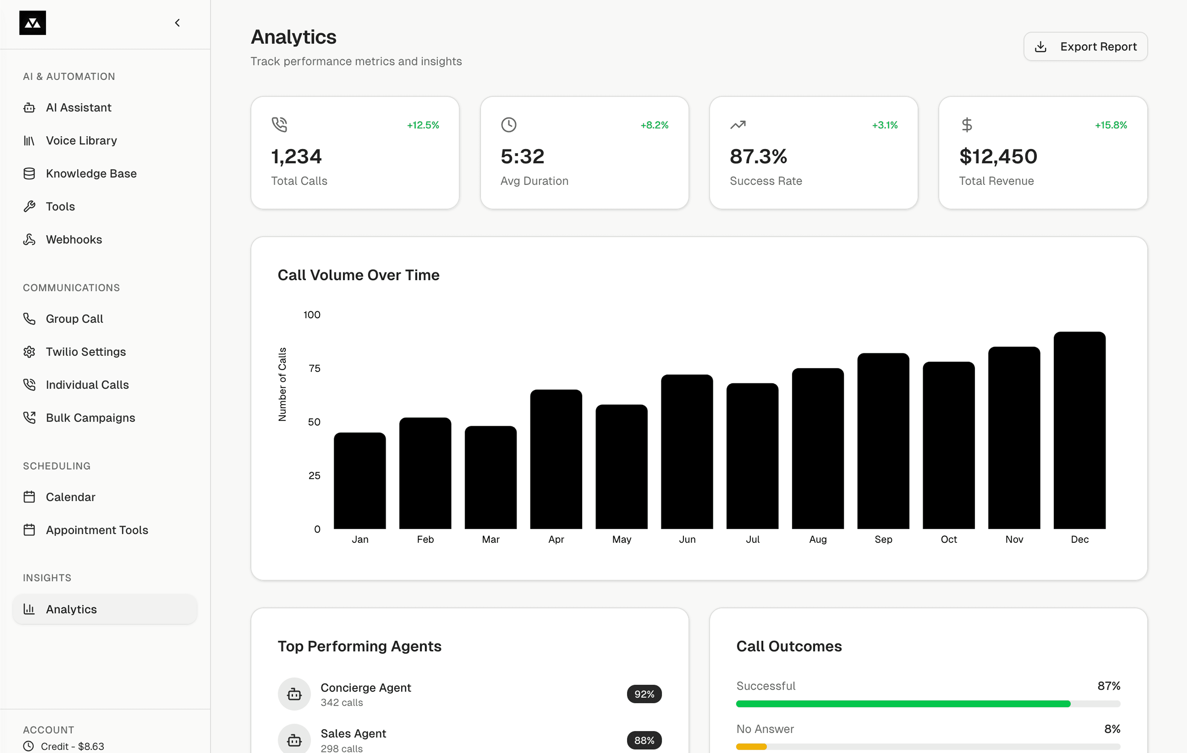 Track performance, analyze calls, and optimize responses with real-time AI insights.